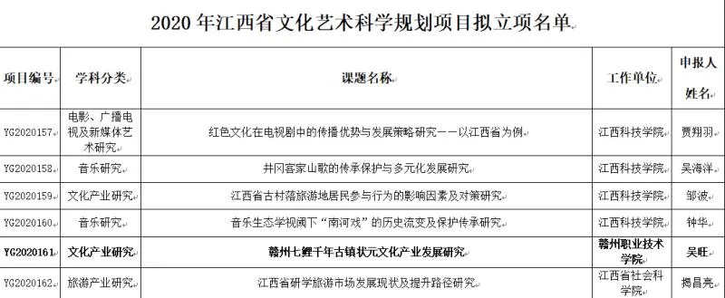 从江西省文化和旅游厅《关于印发2020年度江西省文化艺术科学规划一般项目立项名单的通知》(赣文艺规〔2020〕4号)获悉,我院马克思主义学院吴旺同志主持的《赣州七鲤千年古镇状元文化产业发展研究》(编号:YG2020161;文化产业研究类)获批立项,这是我院首次获该项目的立项。