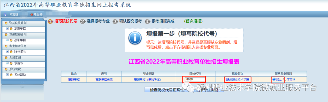 进入网上报考系统后点击“院校报考”,输入雷竞技官网代码“8689”,点击服从专业调剂“服从”后,点击“进入选择专业界面”。