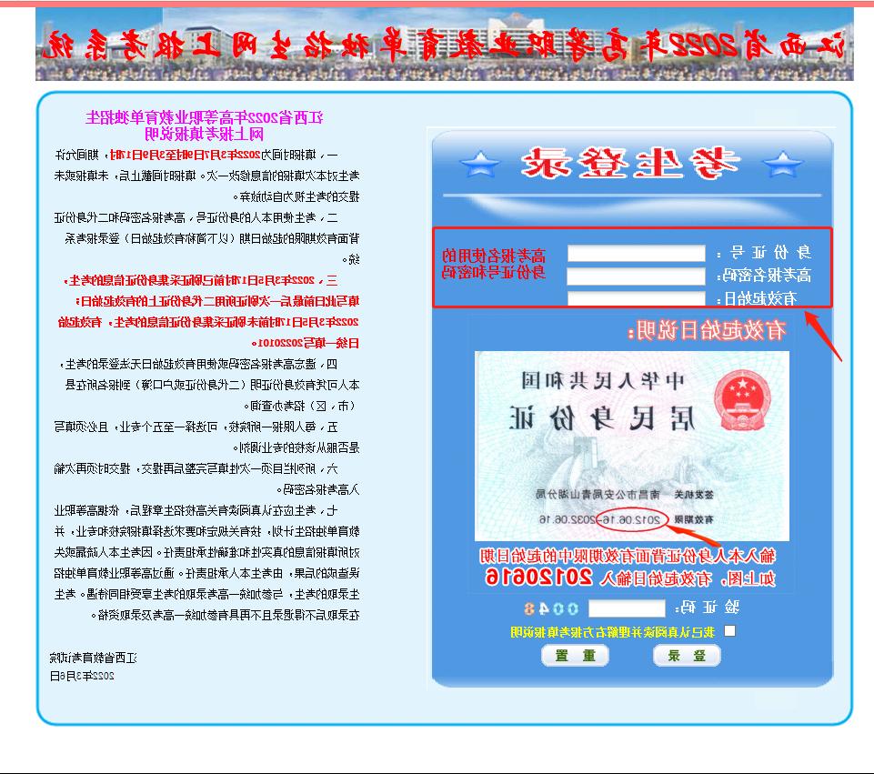 2.考生使用本人的身份证号、高考报名密码和二代身份证背面有效期限的起始日期(以下简称有效起始日)登录报考系统。