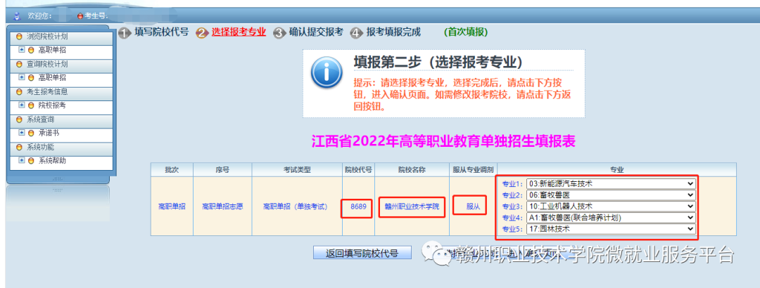 7.考生应在认真阅读有关高校招生章程后,依据高等职业教育单独招生计划,按有关规定和要求选择填报院校和专业,并对所填报信息的真实性和准确性承担责任。因考生本人疏漏或失误造成的后果,由考生本人承担责任。通过高等职业教育单独招生录取的考生,与参加统一高考录取的考生享受相同待遇。考生在录取后不得退录且不再具有参加统一高考及录取资格。