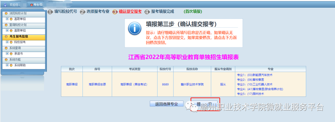 进入确认提交报考页面后,仔细确认所填写信息是否正确,如果确认无误,点击下方按钮提交。