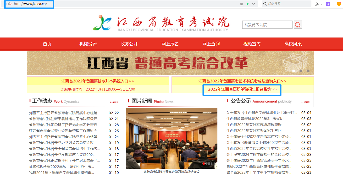 方式一:访问江西省教育考试院官网(http://www.jxeea.cn/),在首页点击“2022年江西省高职单独招生报名系统”,即可访问报考;