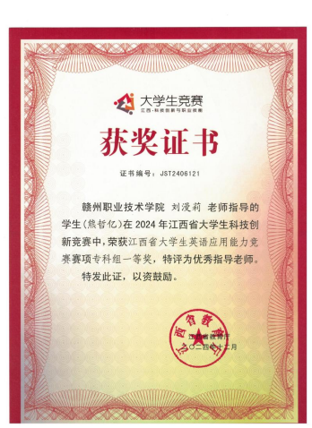 在此次比赛中,由公共基础部的刘漫莉老师指导的熊哲亿同学与来自全省的75所院校的356名参赛选手进行激烈角逐,获得江西省大学生英语应用能力竞赛赛项专科组一等奖,实现了本校在此赛项上新的突破。