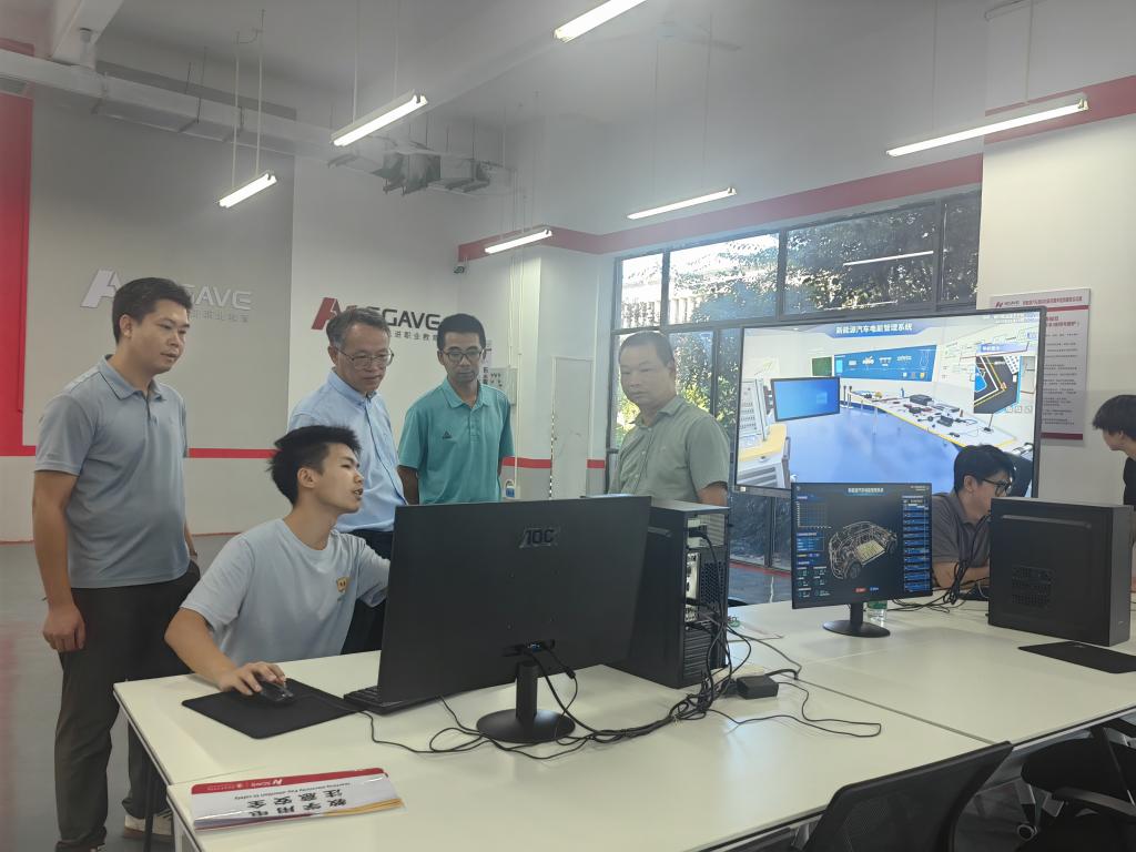 吴跃文实地考察了项目培训室、虚拟仿真实训室、技能实操实训室,了解德国“双元制”人才培养模式、“用户委托、工单引领、问题导向”授课模式、“导学、信息、规划、决策、执行、检查、评判、系统化”八步教学法等项目运行情况,观摩学生虚拟仿真和实操技能训练,详情询问项目教师教学、学生课程学习及技能实践等方面的情况。项目团队就人才培养模式创新、课程资源转化建设、教学团队国际化赋能、教科研成果孵化、区域产业经济服务等方面进行了详细汇报。