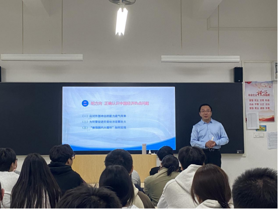 随后,他以精炼语言梳理中国经济宏观方向与发展底气,系统阐述中国经济强大的韧性、庞大的市场、完整的产业体系及党的坚强领导等独特优势,增强同学们对国家发展前景的信心,同时强调促进民营经济发展壮大对激发市场活力的关键作用,深入阐释“做强国内大循环” 作为推动高质量发展关键支撑的战略意义。湛邵斌在课程的尾声抛出“外部冲击下,中国经济何以这么稳?”这一思考题,不仅是对前文中国经济发展底气与应对策略内容的巧妙呼应,更以问题为引,成功引发师生的深刻思考。