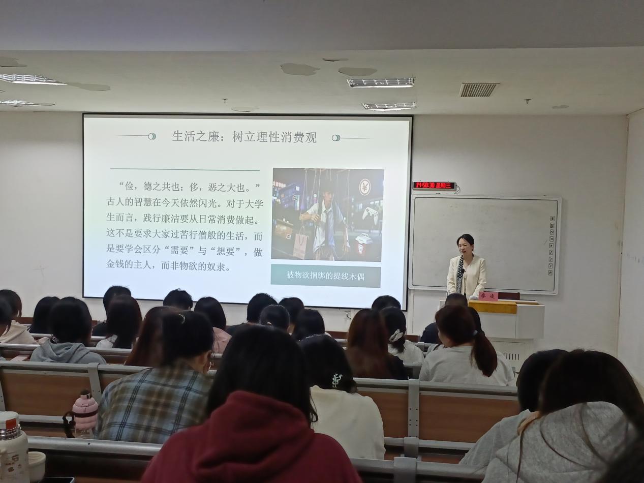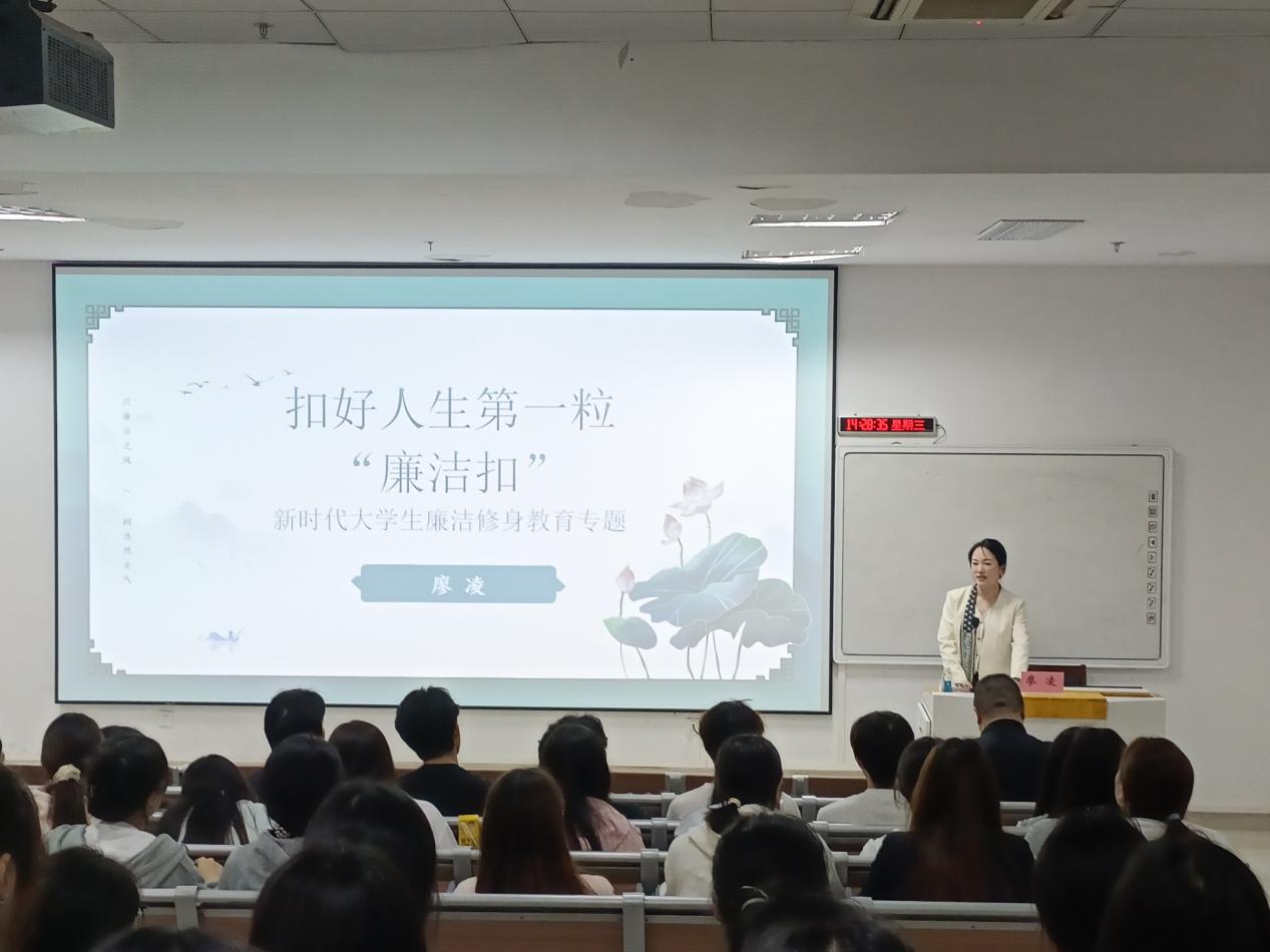 为深入学习贯彻习近平新时代中国特色社会主义思想和党的二十届四中全会精神,落实立德树人根本任务,引导青年学生树立正确的廉洁观,扣好人生第一粒“廉洁扣”,4月8日下午,学校党委委员、纪委书记廖凌为经济管理学院党员教师代表及学生讲授了一堂内涵深刻、贴近实际的廉洁主题思政课。