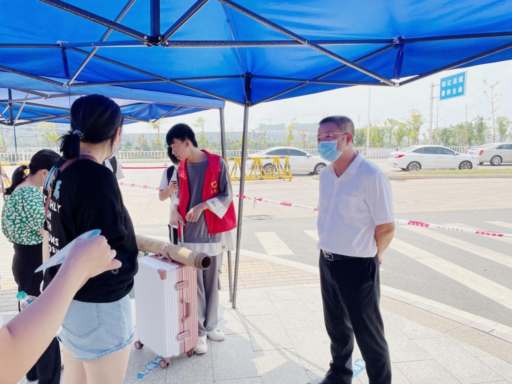 邹志华在宣传统战部、学生工作处、纪委监督检查室、保卫处、继续教育与培训部等部门负责同志陪同下,来到校门口测温点、报到缴费大厅等地,查看新生报到通道设置、疫情防控措施落实,了解新生报到注册和住宿等方面的情况。