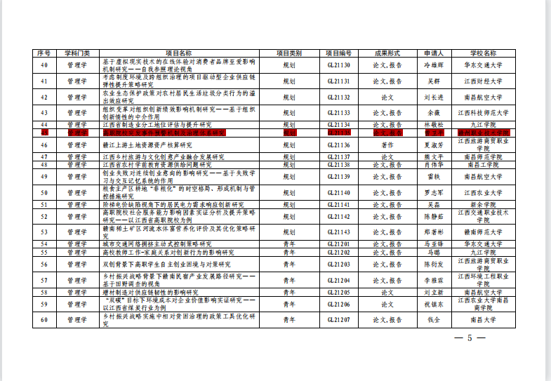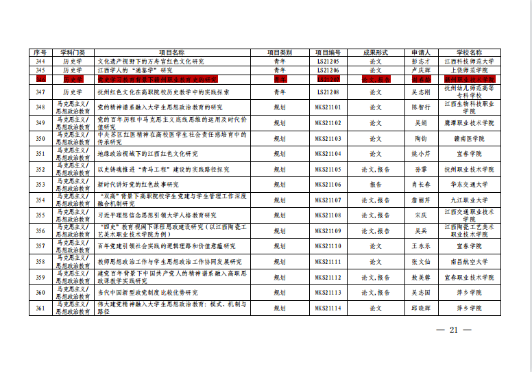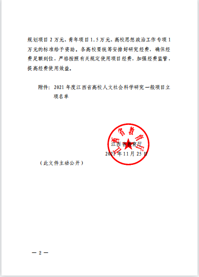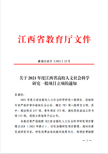 近日,从省教育厅下发的《关于2021年度江西省高校人文社会科学研究一般项目立项的通知》(赣教社政字〔2021〕23号)获悉,我院共有2项2021年度江西省高校人文社会科学研究一般项目获准立项,具体名单如下: