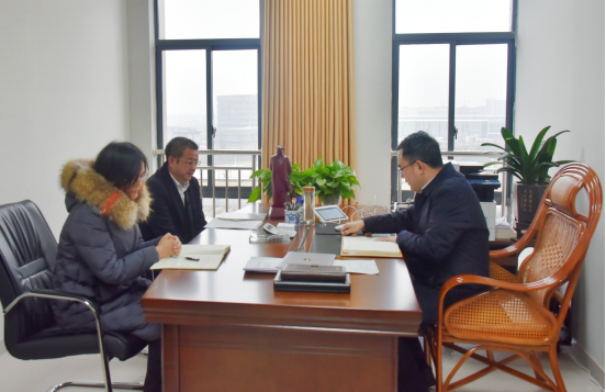1月17日上午,党委书记温学延在行知楼六楼614办公室与欧阳荣华、陈妍利两位教师进行交流座谈。