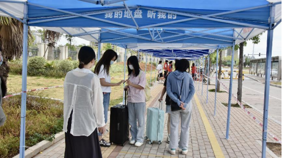 党委委员熊晓林在科技城校区查看老生返校工作,关心志愿者的身体状况。学院教师和学生志愿者们认真查看返校学生48小时内核酸检测阴性证明和“三码”,随后返校学生测温入校、报到登记、入住寝室,一切都严谨有序,有条不紊。