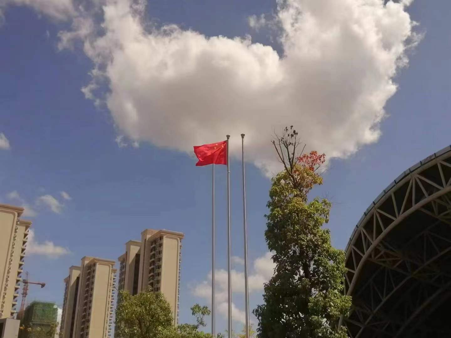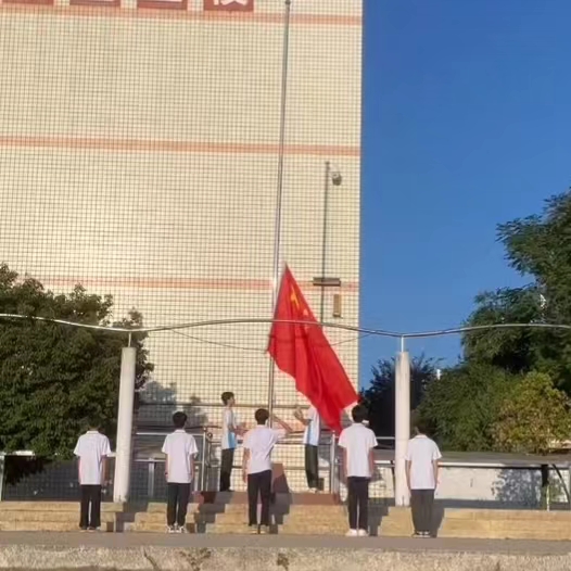 迎着朝阳,旗手们护卫着国旗,迈着铿锵有力的步伐走向升旗台。伴随着激昂的国歌,五星红旗冉冉升起,全体师生面向国旗庄严肃立,行注目礼并唱国歌。