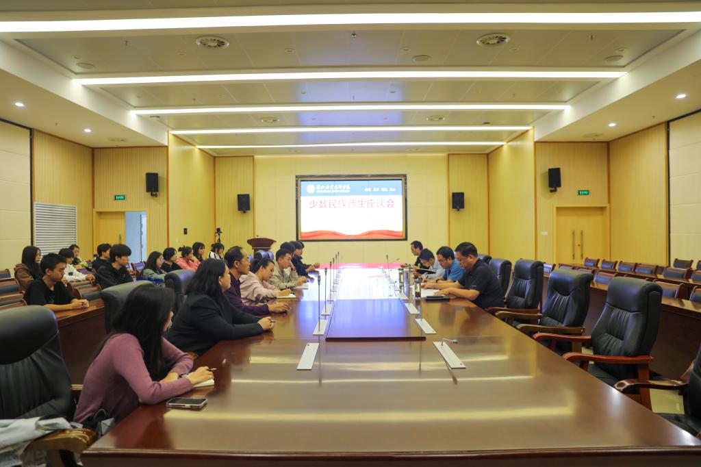 为深入学习贯彻习近平总书记关于加强和改进民族工作的重要思想,全面了解少数民族师生思想、学习和生活情况,促进各族师生交往交流交融,铸牢中华民族共同体意识,10月20日上午,学院在行知楼二楼会议室召开少数民族师生代表座谈会。党委书记温学延出席会议并讲话,会议由党委副书记汤晓军主持,党委委员、宣传统战部部长曾卫平,少数民族教师、各院系少数民族学生代表参加座谈会。