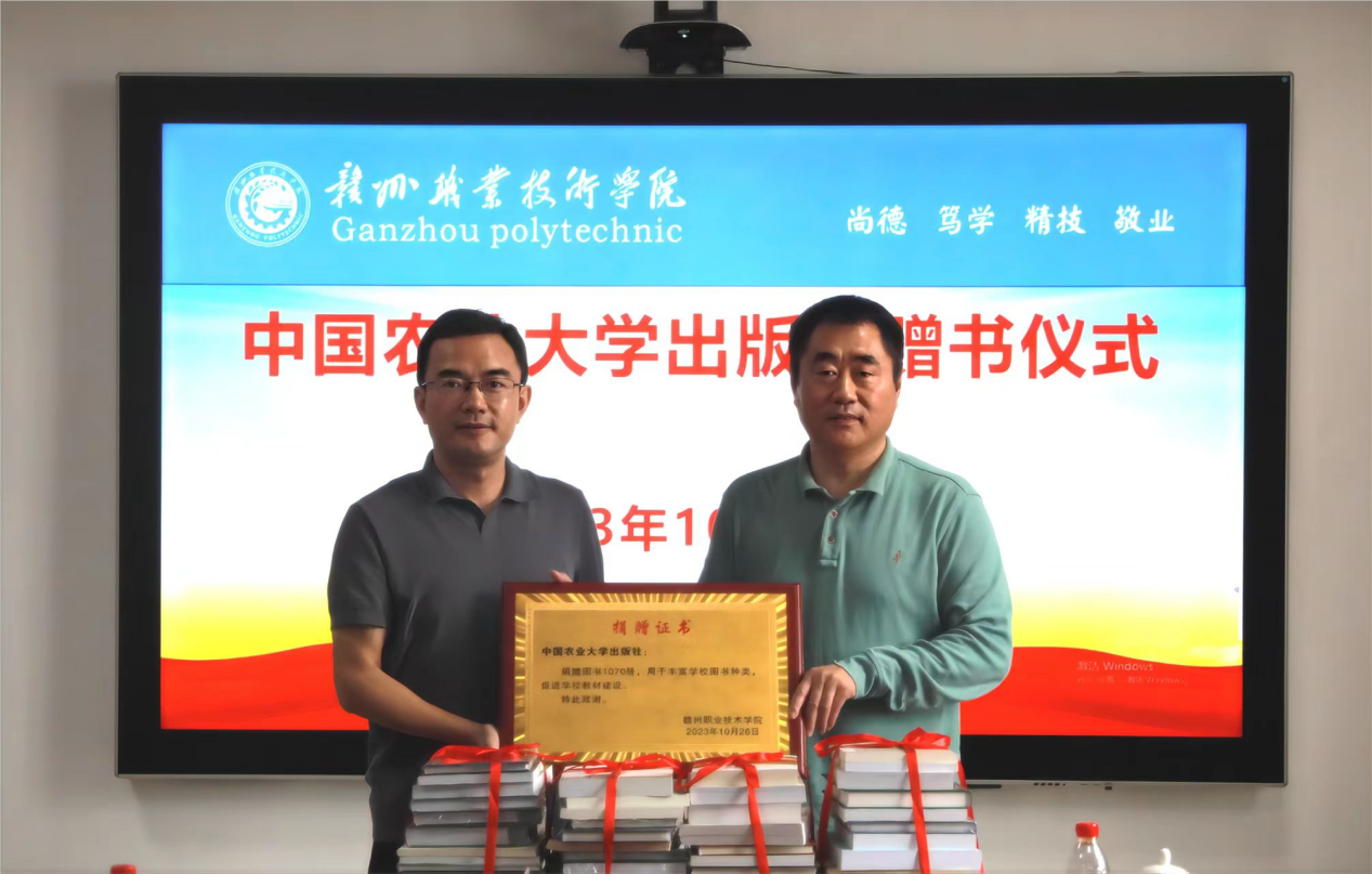 董夫才介绍了中国农业大学出版社的相关情况及“十四五规划”教材建设取得的成绩,并代表中国农业大学出版社向我院无偿捐赠1070册图书,温学延代表学院全体师生向出版社赠送荣誉证书,表示感谢。
