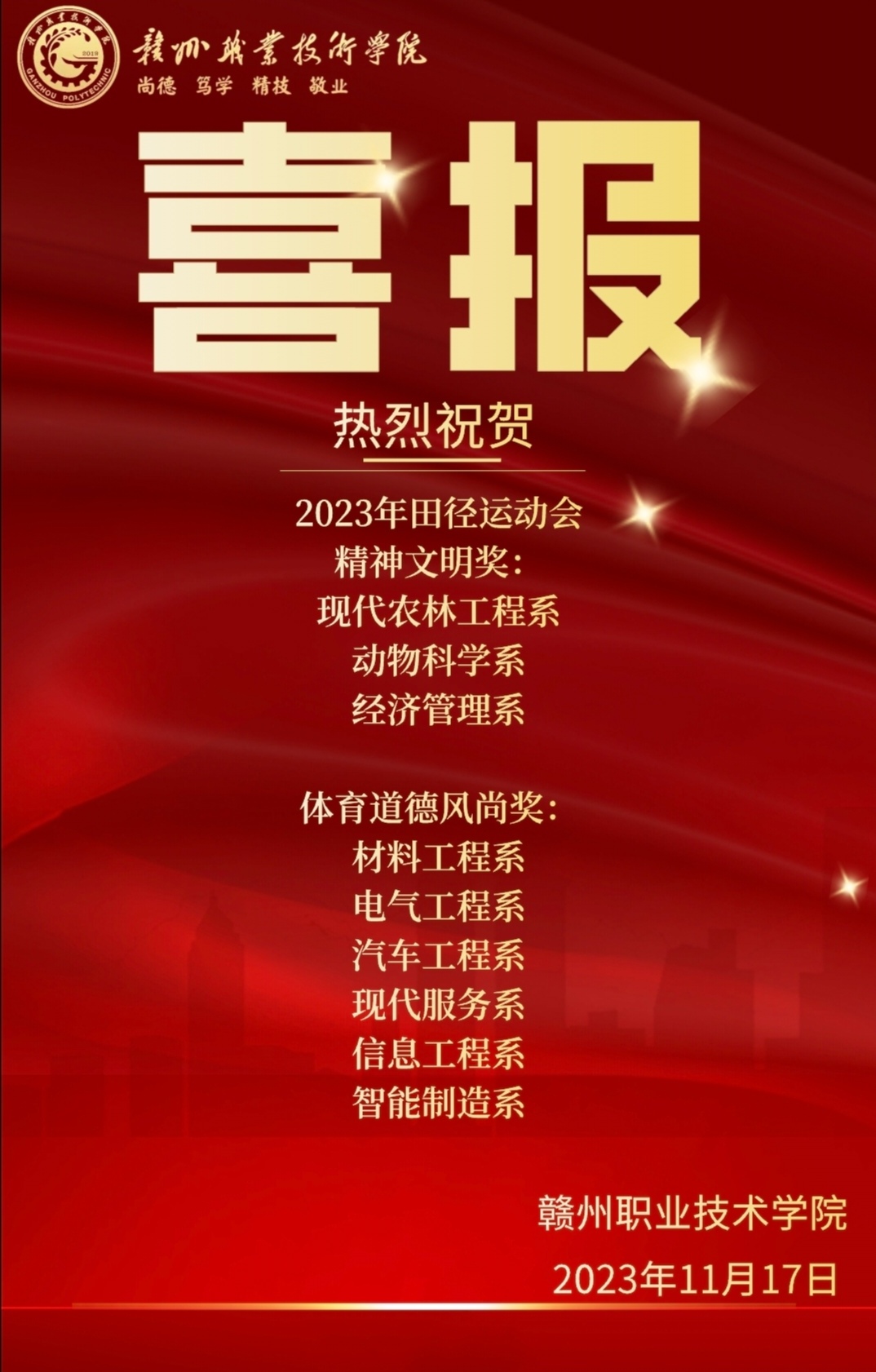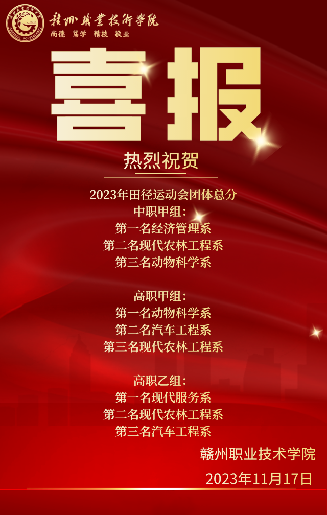 青春恰似火,逐梦正当时。经过为期三天的激烈比赛及全体运动员、裁判员和工作人员的共同努力,11月17日下午,雷竞技电竞平台官网第五届田径运动会、赣州农业学校第二十八届田径运动会、江西赣州技师学院第三十二届田径运动会在学院南运动场圆满闭幕。