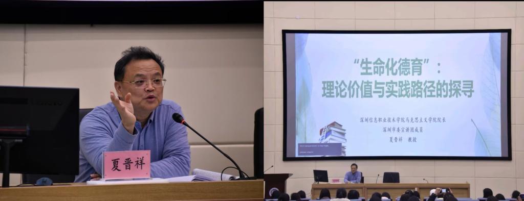 深圳信息职业技术学院马克思主义学院院长、教授夏晋祥作了题为《生命化德育——理论价值与实践路径的探寻》的专题讲座。夏晋祥教授指出,“生命化德育”是赏识生命、激励生命、成就生命的教育,是以尊重、关怀、提升、完善所有生命为旨趣的教育,是个性化、完整化、生活化的教育,其反映了德育工作内在本质与规律。在“生命化德育”实践中,积极探索“生命化德育”的实践路径,构建了“读(看)、议、讲、用”生命化德育课堂教学新模式,这种“生命化德育”课堂教学模式的各个环节都是以学生为主,充分激发了学生学习的积极性和创造性,使学生的生命潜能得到了充分的发挥。