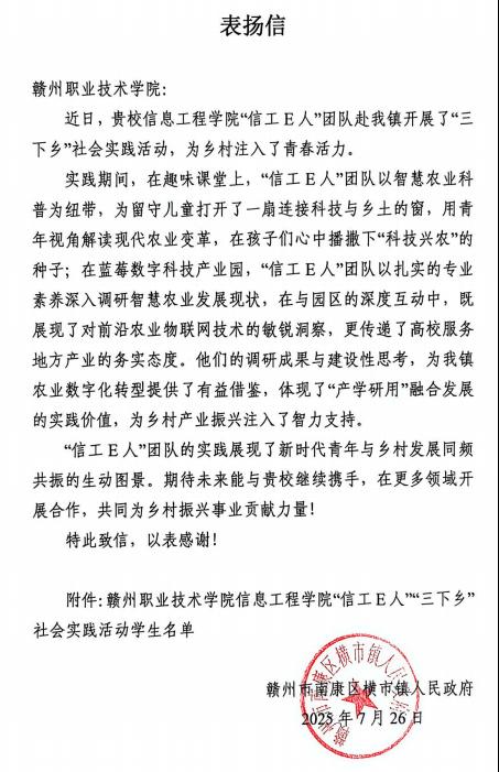 近日,赣州市南康区横市镇人民政府向学校发来表扬信,对学校信息工程学院“信工E人”团队在当地开展的“三下乡”社会实践活动给予高度肯定,称赞团队用青春力量为乡村注入活力,以专业素养助力乡村振兴。