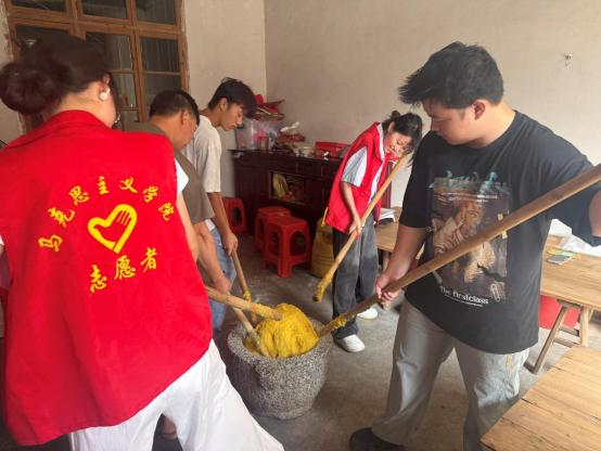 队员们在圩镇体验了省级非遗黄元米果的制作,从“千锤万砸”的捶打工序中,感受客家先民的勤劳智慧与文化传承。