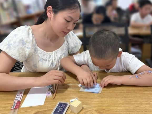 趣传篆刻方寸承心:为让非遗篆刻艺术走进儿童世界,实践队创新打造“安全版”篆刻体验课——以海绵纸替代石材,用压痕笔替换刻刀,让这项古老技艺变身孩子们能驾驭的趣味活动。“小小篆刻家”屏息凝神刻画“平安”与吉祥纹样。队员在指导运笔力度时巧妙引导:“篆刻讲究‘铁笔银钩’,就像做人要挺直腰杆。”这实现了技艺传授与价值引领的深度融合,使篆刻课堂超越了单纯的技能学习,成为厚植文化自信、涵养匠人精神的生动载体。