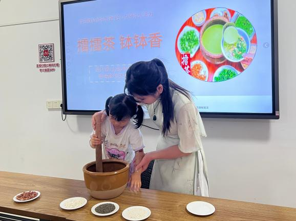 客家擂茶茶香传韵:实践队引导孩子们沉浸式体验擂茶制作全流程。一句“擂杵转呀转,碾出的是茶香,续上的是老祖宗的智慧”的生动讲解,瞬间拉近古今距离。孩子们踮脚擂茶的瞬间,是与客家先辈的跨时空对话。研磨、注水、品饮,客家饮食文化基因在体验中悄然流淌。孩童“原来爷爷爱喝的茶里藏着这么多故事”的感悟和家长“非遗离我们这么近”的社交媒体分享,生动诠释了“见人见物见生活”的传承真谛。这种体验式传承,让客家擂茶从静态符号变为可感知的生活方式,是青年活化传统文化、连接生活场景的创新实践。