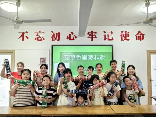 手作温情巧解民需:实践队细心捕捉居民健康需求,在查阅资料多方请教后,创新设计艾草护颈枕手作活动。活动现场艾香氤氲,亲子搭档默契协作,将温经通络的艾草仔细装入枕套。指尖的温度与草本的芬芳在协作中交融,制成的不仅是一件实用好物,更是一份承载关怀的健康礼物。参与制作的阿姨笑着说:“以前只知艾草能驱蚊,没想到做枕头这么好,自己孩子亲手做的,睡起来都觉得格外香。”这种基于需求响应、融合传统技艺与健康关怀的沉浸式手作,精准实践了“传艺亦传情”的服务理念。