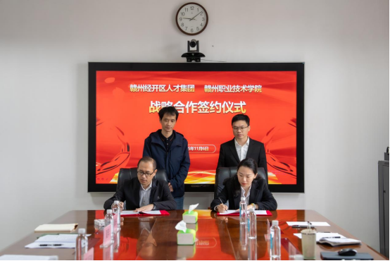 11月6日上午,学校与赣州经开区人才集团举行校企战略合作框架协议签约仪式。信息工程学院院长刘平、党总支书记王明瑞,赣州经开区人才集团总经理欧阳苑汶、赣州经开区技工学校党支部书记曾靓,以及双方相关负责人出席签约仪式。