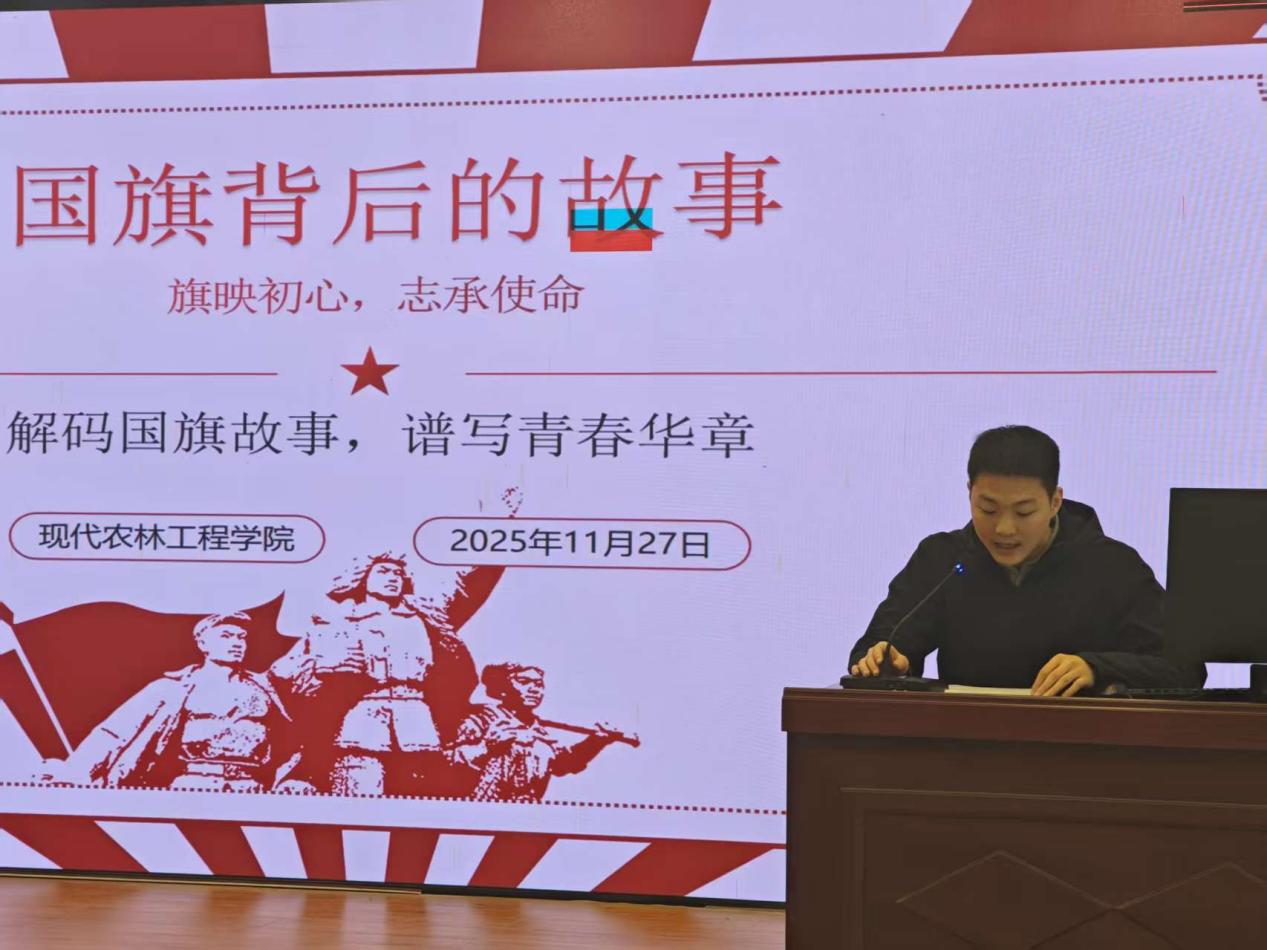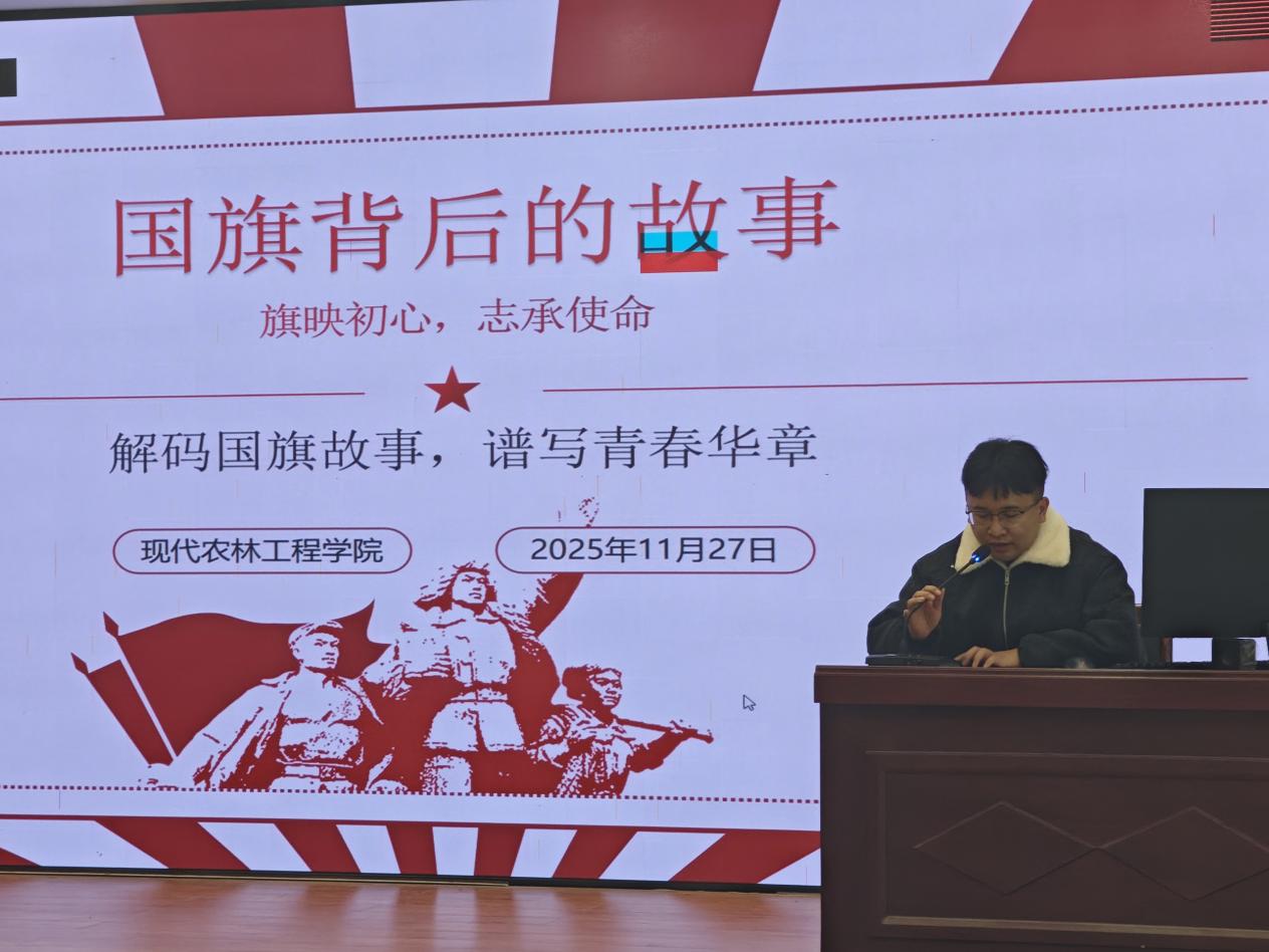为深入挖掘国旗背后的历史底蕴与时代精神,推动爱国主义教育与农林特色深度融合,引导农林学子传承红色基因、勇担强农使命。11月27日晚,现代农林工程学院团总支在毕昇楼301教室成功举办了“旗映初心,志承使命——解码国旗故事,谱写青春华章”主题活动,80余名农林学子齐聚一堂,以国歌合唱为载体,串联国旗背后的历史故事,共同感悟信仰力量,探寻国旗与农林事业交织的动人故事。