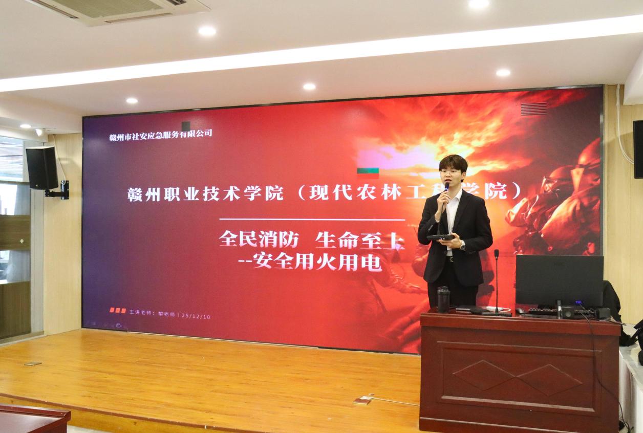 为切实落实学校消防安全工作要求,进一步强化教职工的消防安全意识与应急处置能力,12月10日下午,现代农林工程学院在毕昇楼301教室成功举办以“全民消防 生命至上——安全用火用电”为主题的消防安全知识讲座。本次讲座特别邀请了赣州市社安应急服务有限公司专家黎老师进行专题讲授,黎老师为全体教职工讲授了消防安全知识与火灾自救方法。全院教职工参加了此次培训。