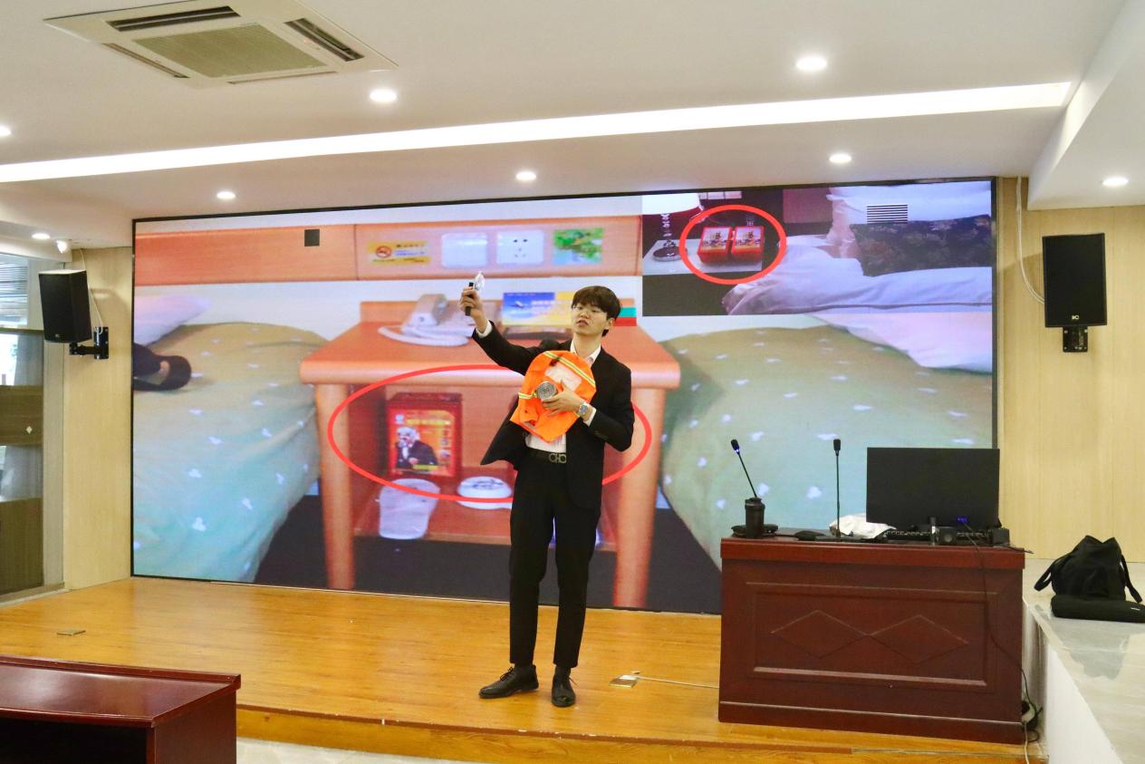 讲座伊始,黎老师以近期新余、香港等地发生的大型火灾事件为切入点,通过播放火灾现场视频、展示案例图片等方式,直观呈现了火灾发生时的场景,深刻剖析了火灾引发的原因及危害。随后,他系统讲解了火灾逃生技巧、防火“八件宝”等知识,重点强调了毛巾防烟、消防栓与灭火器使用方法等核心要点,并针对汽车着火等特殊场景,专门纠正了常见的错误逃生方法,为师生普及了科学避险知识。在实操演示环节,黎老师现场展示了防烟面罩、灭火器等消防器材的正确使用步骤,通过互动教学帮助教职工掌握使用要领,提升实际应用能力。
