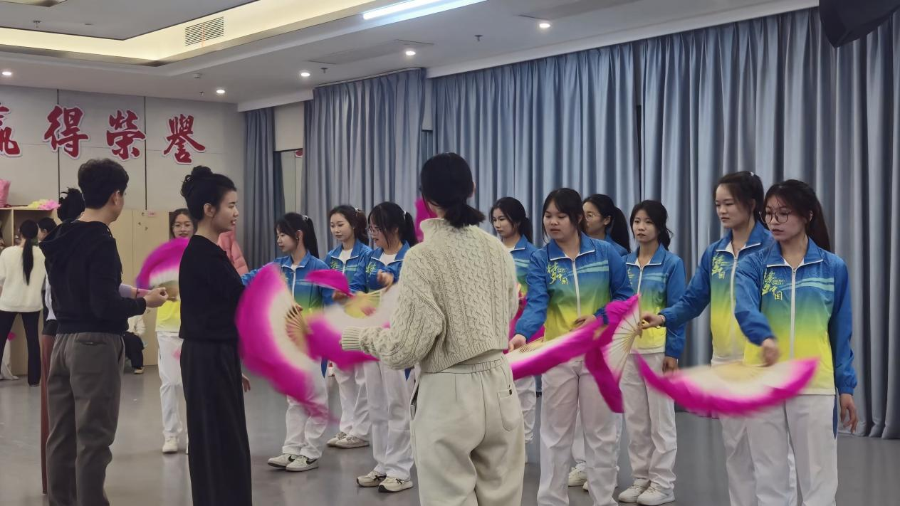 随后,杨俊老师及其学生手把手教大家练习赣南采茶戏的“三绝”—— 矮子步、扇子花、单水袖等经典动作,让同学们在实践互动中切身感受到非遗艺术的独特魅力与匠心传承,使他们对“台上一分钟,台下十年功”的执着坚守有了更为真切的体会。