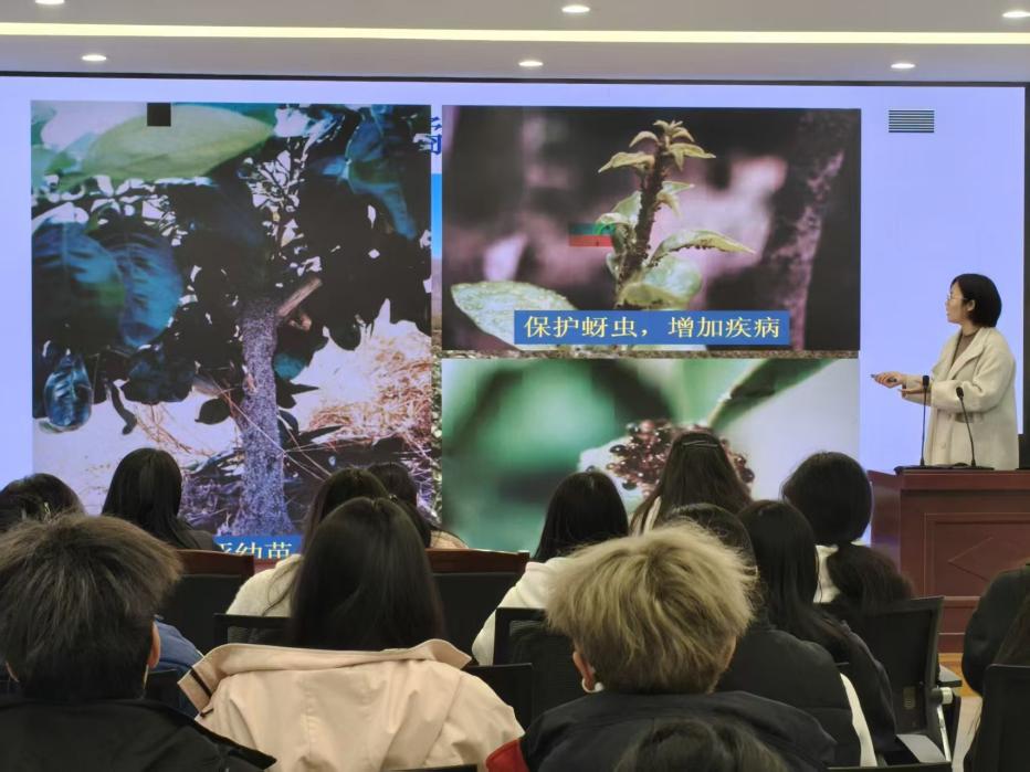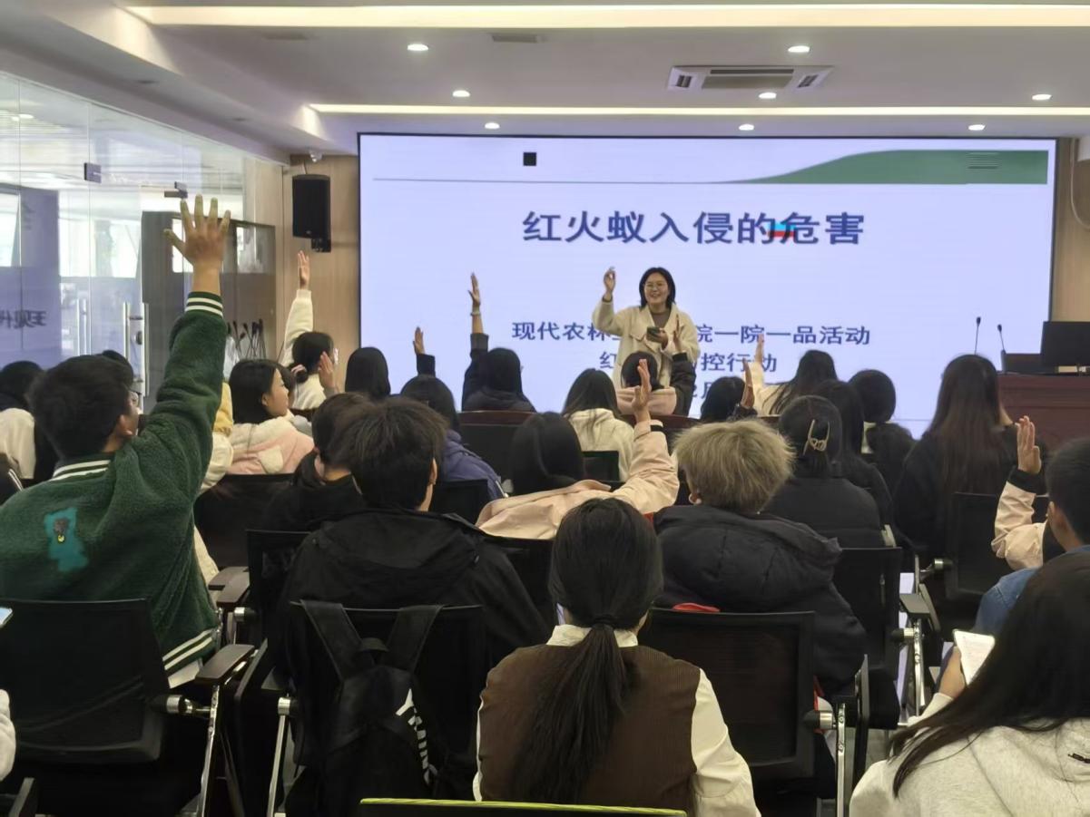 李婷在讲座中凭借扎实的专业知识和丰富的教学经验,围绕红火蚁的生物特性、入侵扩散途径、生态危害以及科学防控技术等方面展开系统讲解。她通过丰富的图片资料和典型案例,深刻剖析了红火蚁对农作物、生物多样性以及对公共安全构成的威胁,并重点介绍了科学监测与绿色防控的关键要点,使同学们认识到红火蚁防控工作的紧迫性与重要性。为充分调动学生参与热情,活动特别设置“学习通”抢答环节,题目紧扣讲解重点,同学们全神贯注、争先作答,课堂上掌声与抢答声此起彼伏,学习氛围浓厚热烈。
