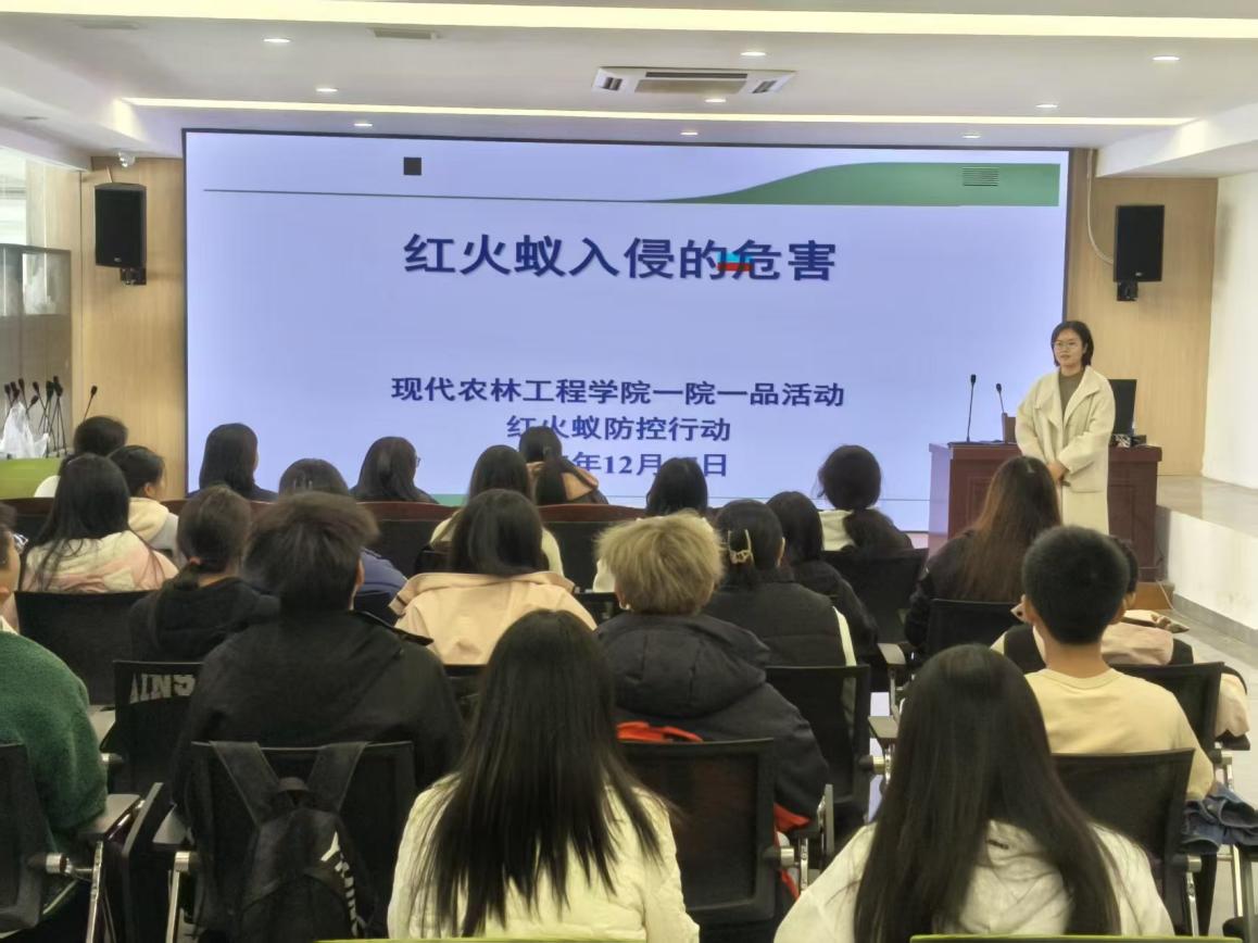 为切实提升学生专业实践能力,筑牢农林生态安全防线,深化“一院一品”特色品牌项目建设,12月17日下午,现代农林工程学院在毕昇楼301教室举办“一院一品”红火蚁科学防控科普讲座,并组织师生前往室外实践基地开展现场教学。活动由园艺教研组老师李婷担任主讲,并特别邀请赣州果乐多农业供应链有限公司邹津津经理,就毒饵防治红火蚁进行专业讲解。
