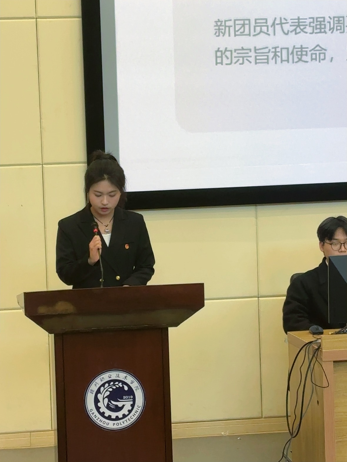 在领誓人龚老师的带领下,全体新团员面向团旗庄严宣誓:“我志愿加入中国共产主义青年团,坚决拥护中国共产党的领导……为共产主义事业而奋斗!”铿锵有力的誓言回荡在会场,表达了新时代青年听党话、跟党走的坚定决心。新团员代表叶纸鸢在发言中表示,请党放心,强国有我,我们将珍惜韶华,不负光阴,在专业领域深耕细作,在科创浪潮中勇攀高峰。以勤学长知识,以笃行练本领,努力成为可堪大用、能担重任的时代新人。
