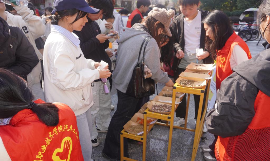 香囊DIY区则成为活动的人气焦点。工作人员提前备好丰富的香囊制作材料,同学们只需答对志愿者提出的心理健康问题中的一道,便可领取材料包,用十余种香料搭配自由制作专属香囊。大家认真挑选、调配香料,将选好的香料装入香囊袋中,馥郁的香气在现场缓缓散开,专注的手作过程让焦虑与疲惫悄然消散,一个个满载心意的香囊,成为独属于同学们的“心灵疗愈信物”。