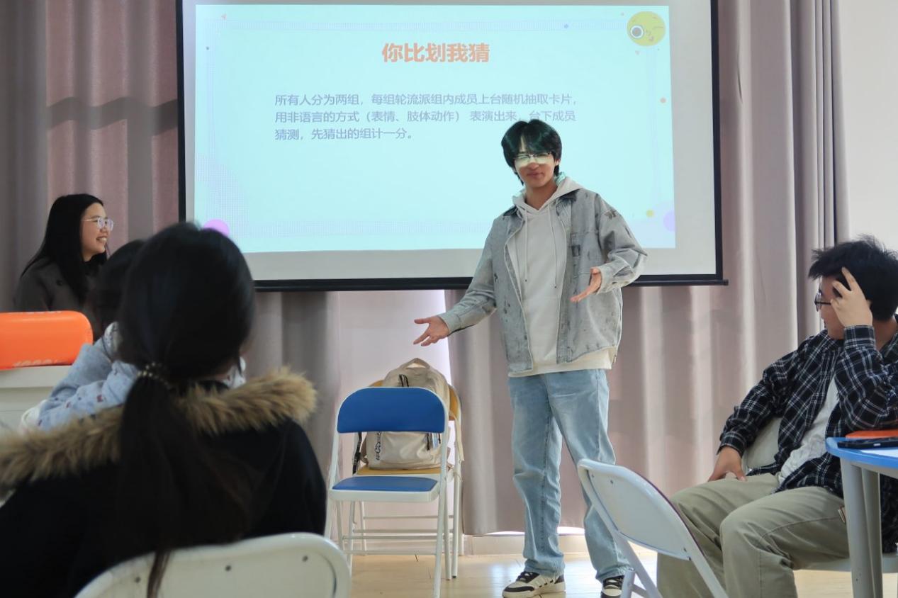 结合大学生心理发展特点,本次活动精心设计系列团体互动环节。“情绪代号”引导同学们用带有情绪色彩的短句介绍自己,增进彼此认识;“心灵麦克风”则通过趣味问答,加深成员间的印象与促进交流。随后的“你比划我猜”环节,将参与者分为两组进行竞技,现场气氛热烈,大家在欢笑声中体验情绪的表达与感知。
