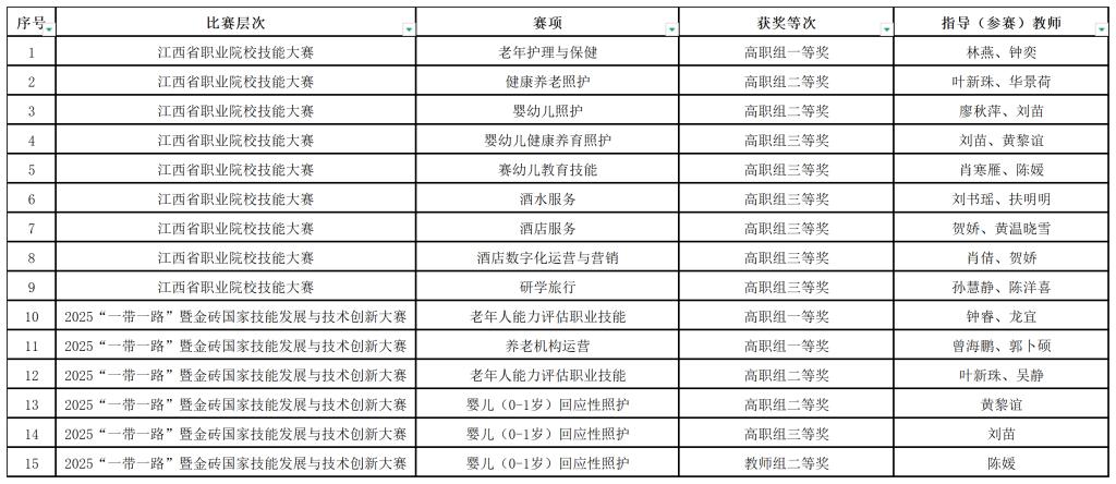 学院高度重视以赛促学、以赛促练,积极组织师生参与不同层次的技能竞赛。在省级赛事方面,江西省职业院校技能大赛中,学院参赛团队凭借扎实的专业功底斩获9项奖项,涉及老年护理与保健、健康养老照护、婴幼儿照护等多个赛项。其中,“老年护理与保健”项目更是夺得高职组一等奖,展现了学院在老年护理领域的教学优势。
