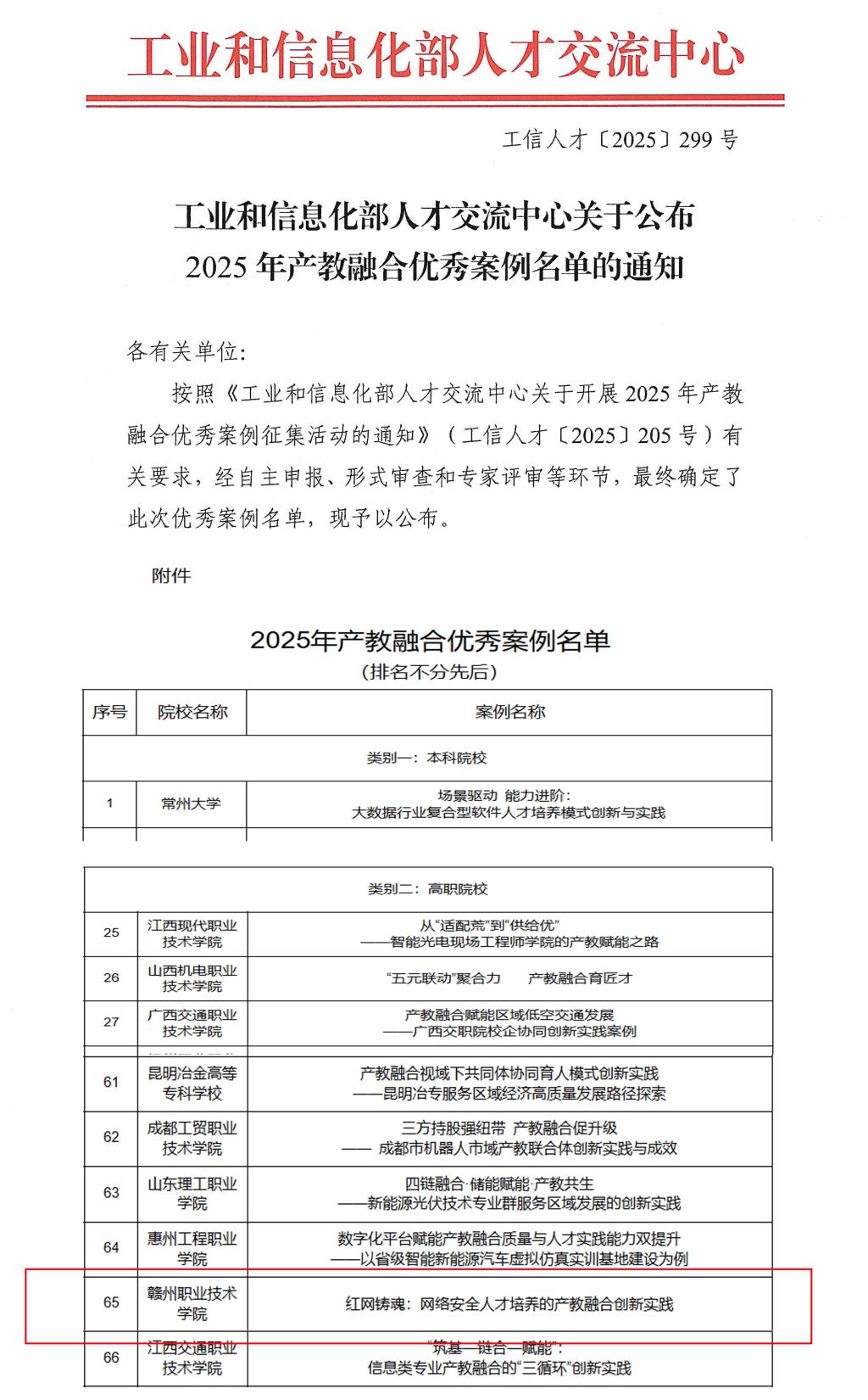 近日,工业和信息化部人才交流中心正式公布2025年产教融合优秀案例名单,学校报送的“红网铸魂:网络安全人才培养的产教融合创新实践”案例凭借鲜明的特色、扎实的实践与显著的成效,经过自主申报、形式审查、专家评审等多轮严格筛选,成功入选高职院校类别优秀案例,这是学校深化产教融合、推进育人模式创新的重要成果,更是行业主管部门与专家学者对学院人才培养工作的高度认可!