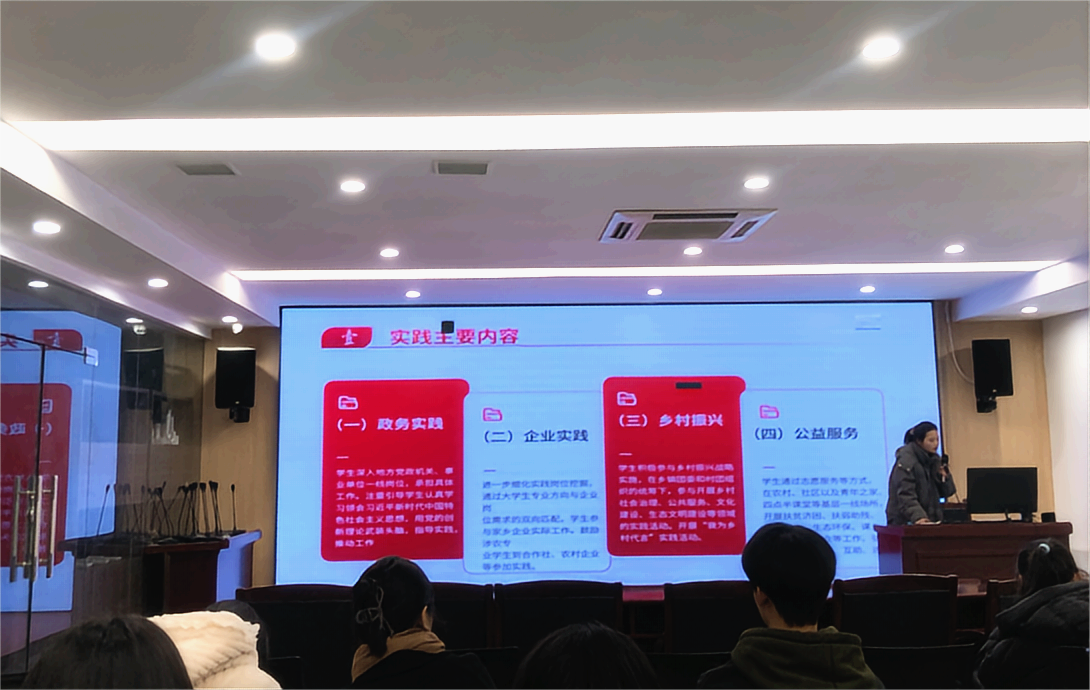 大会伊始,黄遥遥同学围绕活动意义、招募岗位类别、报名流程细则、考核标准等核心内容进行了全面介绍。她系统解读了政务实践、企业实践、乡村振兴、公益服务、社区服务、兼职锻炼、文化宣传和网络“云实践”八大类实践方向,鼓励同学们立足专业所长,在基层一线锤炼过硬本领、积累实战经验。随后,作为活动宣讲代表,她就实践时长、材料准备、时间节点等具体事项作了详细说明,为同学们提供了清晰的实践指引。