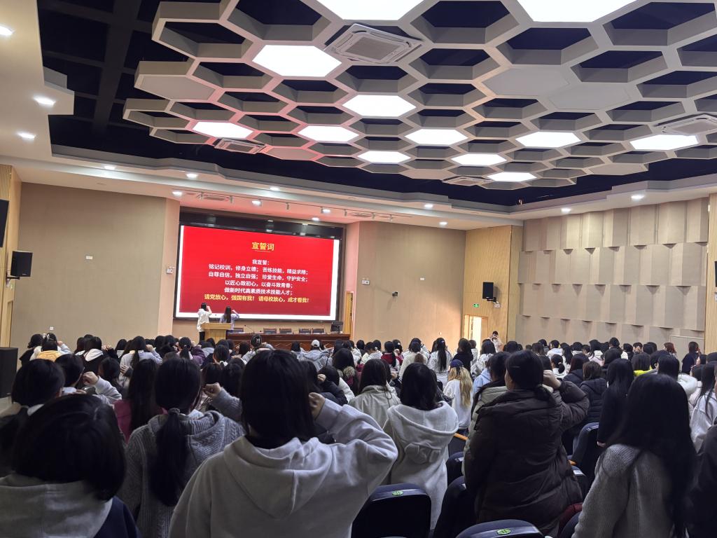 大会最庄严的时刻到来。全体女生起立,右手握拳举过肩头,跟随领誓人庄严宣誓:“铭记校训,修身立德;苦练技能,精益求精;自尊自信,独立自强;珍爱生命,守护安全;以匠心致初心,以奋斗致青春;做新时代高素质技术技能人才;请党放心,强国有我!请母校放心,成才看我!”铿锵誓言响彻报告厅,彰显了材料工程学院女生的青春担当与坚定信念。