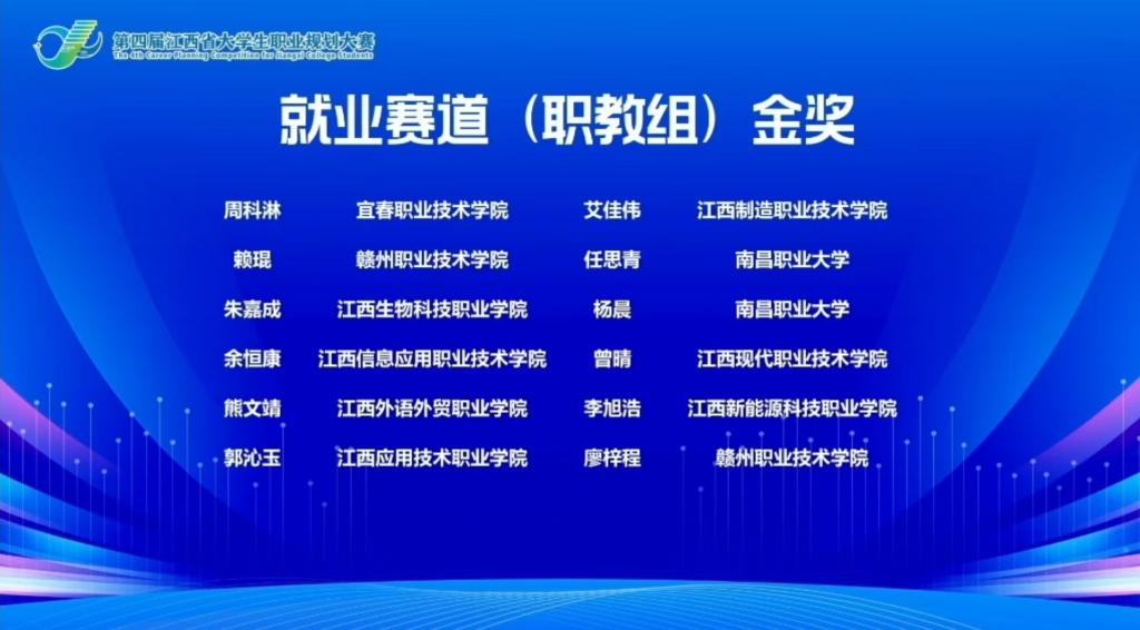 近日,江西省第四届大学生职业规划大赛圆满结束。经过激烈角逐,雷竞技电竞平台官网学子在本次大赛中表现稳健,获得4金1铜好成绩,学校同时荣获“优秀组织奖”。