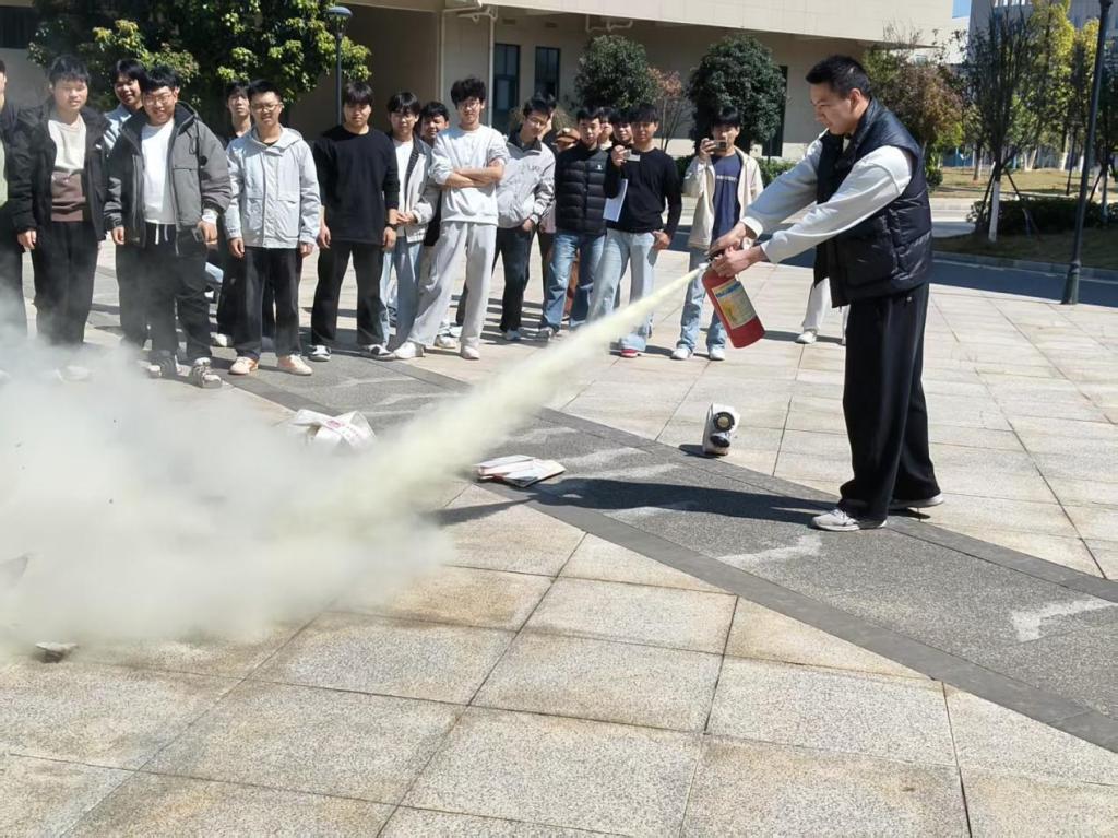 3月11日下午1点40分,吉顺老师现场演示了干粉灭火器的使用方法,并精炼概括了“提、拔、握、压”四字操作技巧;随后,曹晓刚老师演示了消防水带快速展开、连接与使用方法。参训的学生和老师都积极参与了灭火器及水带的实操体验,进一步筑牢了安全防线,为后续演练开展打下坚实基础。