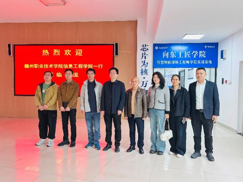 近日,信息工程学院院长刘平,教师练云翔、吕志铭,联合中国电信赣州分公司相关代表,赴九江职业大学开展产教融合专题座谈交流。调研团实地走访向东工匠学院、中软国际信创产业学院,围绕党建引领、产业导向、双师队伍培育、现场工程师培养等关键领域深入研讨,为校政企协同育人、推动职业教育提质升级凝聚共识、拓展路径。