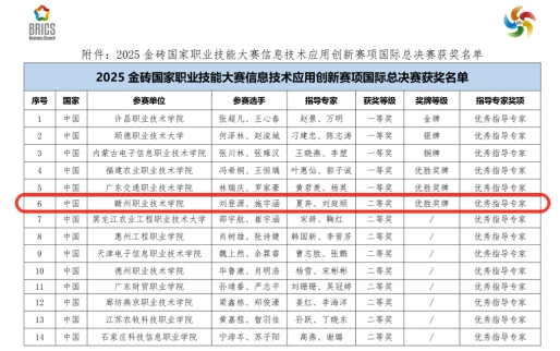 近日,2025年金砖国家职业技能大赛信息技术应用创新赛项中国赛区国际总决赛在河南许昌圆满落幕。雷竞技官网信息工程学院云计算2511班刘登源、大数据2512班施宇涵两位同学,凭借顽强的毅力和扎实的技能,最终在总决赛中奋勇拼搏,斩获二等奖第一名的优异成绩,展现了信工学子过硬的职业素养与专业能力。