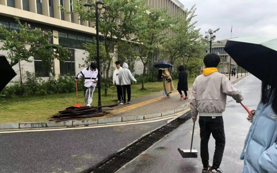 冬季的小雨有点寒凉,但丝毫没有影响学生们劳动的热情。他们打着伞,拿着清洁工具,有条不紊地按照责任区的划分打扫校园。