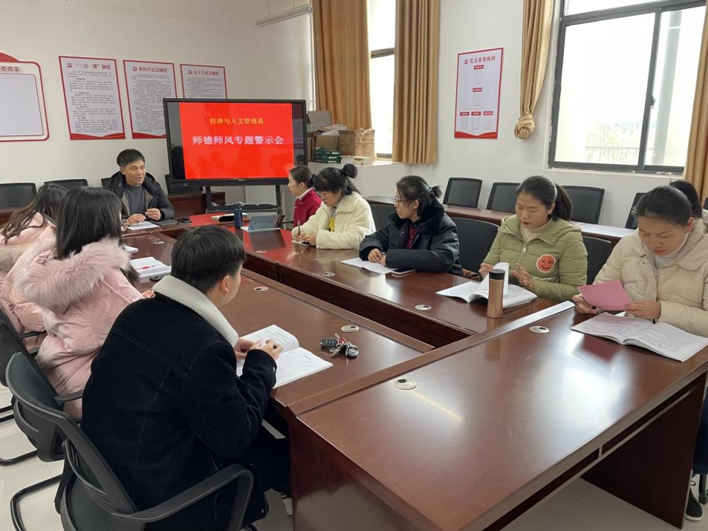 12月21日中午,经济与人文管理系召开师德师风专题警示教育会,会议由系部负责人肖首荣主持,系部全体教职工参加会议。