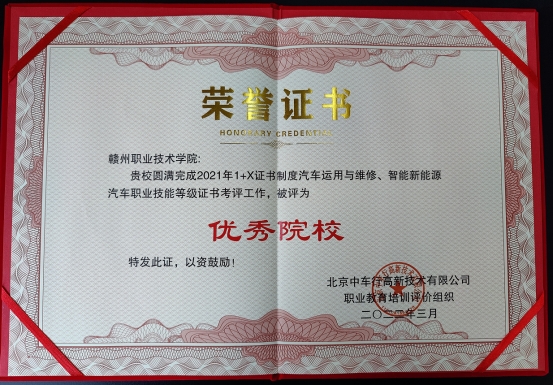 近日,学院汽车工程系收到“1+X”汽车专业领域职业技能等级证书评价组织—北京中车行高新技术有限公司发来的荣誉证书,学院圆满完成2021年“1+X”证书制度汽车运用与维修、智能新能源汽车职业技能等级证书考评工作,成绩优异,被评为“优秀院校”。