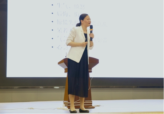 温义媛以轻松活泼的拍手节奏操开场,有效调动了师生的积极性。她从“精神消耗陷阱”展开,用“感觉剥夺实验”“信息过载实验”形象地解释了我们为什么会陷入“精神消耗陷阱”及其危害,并告诉我们正确的面对方法。同时,深入浅出地从“扩大视觉、认知重塑”“好好学习、天天向上”“快乐数招、守护健康”等心理调节方法展开讲述,引起了与会师生的共鸣。
