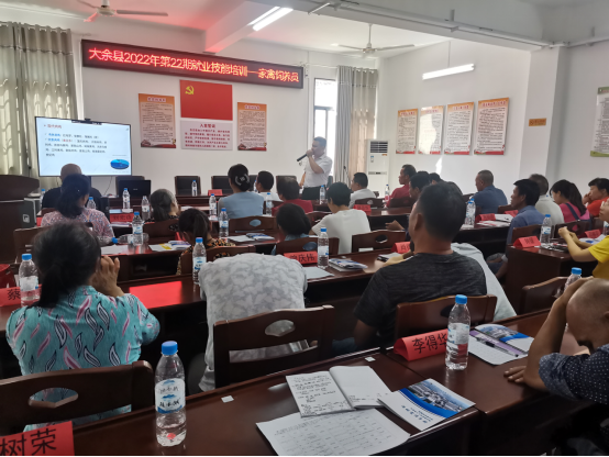 7月12日上午,在南安镇梅山村党群服务中心,举行了“2022年第22期就业技能培训——家禽饲养员”开班仪式,参加仪式的有大余县就业创业培训股股长郭灵芝,南安镇梅山村党群服务中心梅山村第一书记肖修昆,村支部书记罗利聪,综合行政执法大队大队长邓海富,学院动物科学系教师和志愿者们,村镇中的部分养殖户。