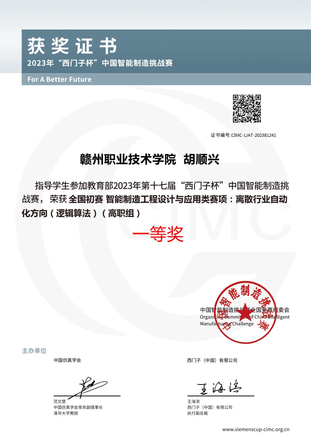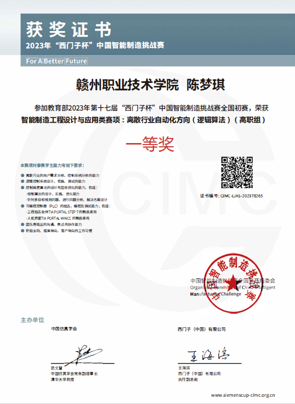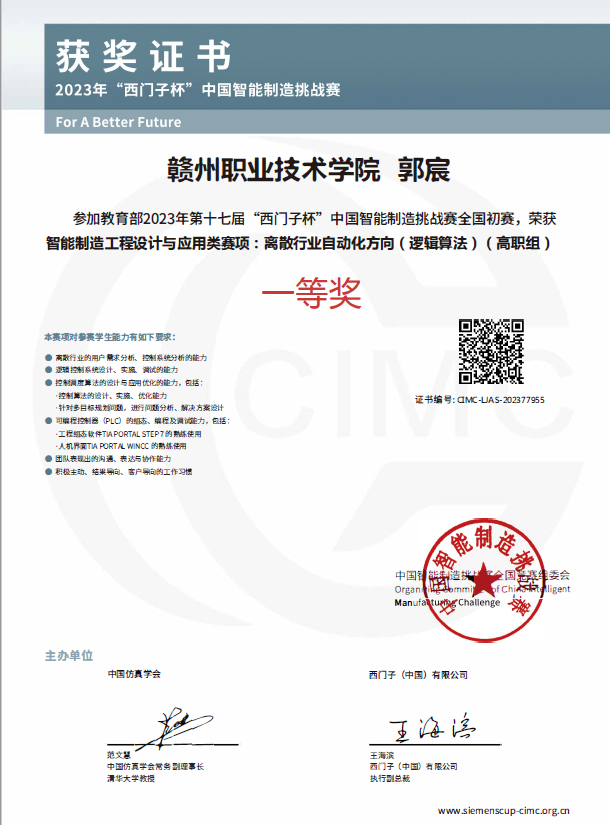 近日,教育部第十七届CIMC“西门子杯”中国智能制造挑战赛圆满闭幕。经过激烈角逐,由学院电气工程系胡顺兴老师指导的池志鸿、陈梦琪、郭宸三名学生荣获全国一等奖;尚文韬、周文杰、孔小平三名学生荣获全国二等奖;何翌、廖源、彭邦宇三名学生荣获全国三等奖。