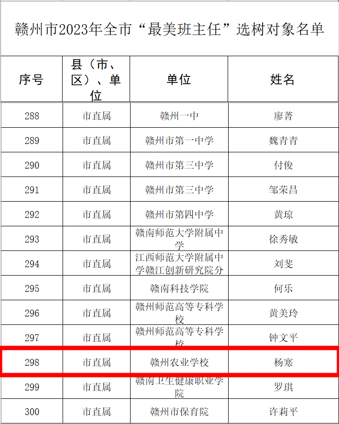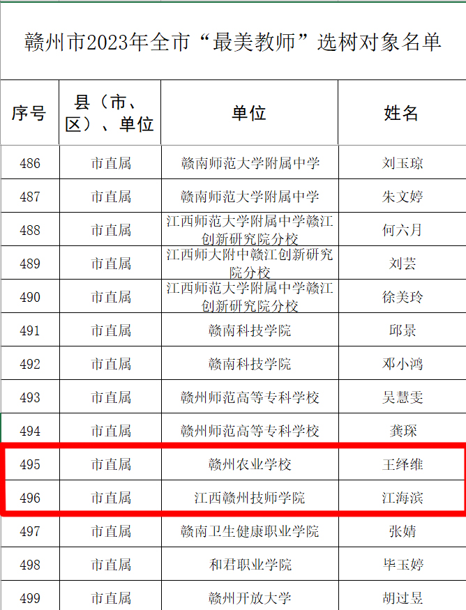 近日,市教育局发布了《关于公布2023年度全市“最美教师”“最美班主任”“育人标兵”选树结果的通知》,我院教师王绎维、江海滨入选为全市“最美教师”选树对象,杨寒入选为全市“最美班主任”选树对象。