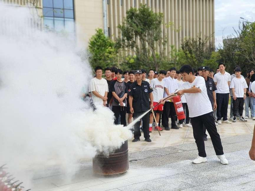 随后,学院保卫处工作人员在广场处开展了灭火操作培训,具体讲解了灭火器和水枪的操作方法,并邀请了多名同学亲自体验使用灭火器灭火及水枪灭火。